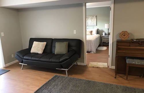 Tendrás un apartamento en el sótano recién remodelado con luz natural con entrada privada. Dormitorio independiente con una cama queen firme. Hay un futón que se pliega para hacer una cama doble en la sala de estar. Baño con ducha. La cocina tiene una cafetera Keurig con tazas de café, tostadora, olla de agua caliente, microondas y refrigerador, junto con platos y porciones para cuatro. No hay estufa ni bañera.
