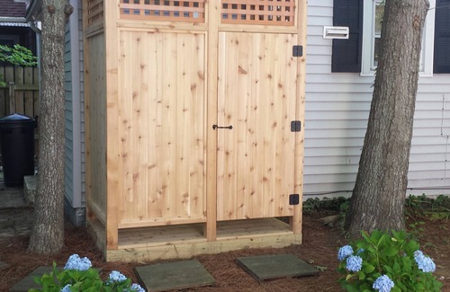 La cabaña tiene pisos de pino viejos originales, está decorada de forma simple y ha sido renovada recientemente: el baño y la cocina se han actualizado con nuevos electrodomésticos y accesorios. Ubicado a cinco cuadras del agua, y a una cuadra de la avenida Rehoboth, los inquilinos pueden caminar hasta boutiques locales, restaurantes, pubs, cafeterías, canchas de tenis, mercado de agricultores y, por supuesto, el paseo marítimo y la playa.