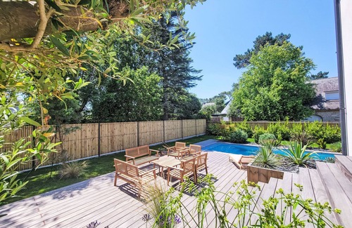 Villa "Villa Azur", muy bonita de 2 plantas del año 2022. En la localidad, a 800 m del centro de Carnac Plage, a 300 m del mar, a, de la playa, orientación sur. Privado: jardín 635 m2 (vallado), piscina climatizada (8 x 3 m, Disponible por temporada: 15.Jun. - 15.Sep.) con escalera interior y sistema de cobertura. Aparcamiento. Tienda de comestibles, supermercado 50 m, restaurante, panadería 1.2 km, café 700 m, playa de arena "Le Men Du" 700 m. Puerto deportivo 4 km, campo de golf (18 hoyos) 15 km, escuela de surf 7 km, escuela de vela 2 km, tenis 1 km. Atracciones en los alrededores: Les Alignements de Carnac 3 km, La Trinité sur Mer 3 km, Presqu'île de Quiberon 15 km, Auray - Port de St Goustan 15 km, Vannes 25 km. Zona de senderismo Golf du Morbihan 20 km. Vecindario muy sensible a ruidos. Se ruega respetar la tranquilidad y normas de buen comportamiento.