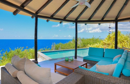 Villa Barranca, newly built in Mexian style, is located on the beautiful west coast of Bonaire at the beginning of the "Scenic Road". During the day you will have a beautiful view of the azure blue sea and after sunset a fantastic view of the clear starry sky from the roof terrace. Take a sip of your cocktail on the covered terrace or jump into your own private, illuminated, pool, enjoy any time of the day.