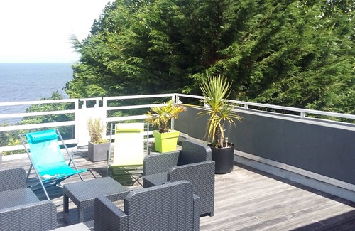Vista excepcional del mar y la costa florecida (Vista panorámica de la azotea - terraza de madera de 40m2).