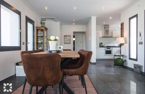 DISTRIBUCIÓN: Esta elegante villa tiene una arquitectura moderna y un cuidado proyecto de interiorismo con toques de estilo colonial en el que se combinan de forma armónica y equilibrada la exclusividad, la calidez y la comodidad en todas sus estancias y sus amplias terrazas. Esta exclusiva villa dispone de 370 m2 habitables distribuidos en dos plantas comunicadas por una escalera interior y dos amplias terrazas. La planta principal se compone de un amplio salón comedor con grandes ventanales que dan acceso directo a una amplia piscina de 8 X 4 metros , una moderna cocina americana totalmente equipada, así como dos dormitorios con camas dobles decorados con un gusto exquisito y un elegante baño con ducha italiana. A destacar la elegancia y confort de la zona de sofás del salón que favorecen las tertulias familiares. Desde el mismo salón se accede a una preciosa terraza lateral equipada con mesa y sillas exteriores, una zona de sofás y de barbacoa con vistas abiertas a la montaña. En la planta superior, a la que se accede a través de unas amplias escaleras desde el salón, encontramos un amplio dormitorio principal con cama de matrimonio, un baño con ducha italiana así como una gran terraza con un confortable sofá chaise longe y una cama balinesa ideal para relajarse leyendo un libro o disfrutando de la compañía de tu pareja. Hay también una segunda terraza solarium con tumbonas con orientación inversa a la terraza principal que permite que se pueda disfrutar a conveniencia del sol o la sombra a cualquier hora del día. La planta baja de la vivienda tiene aire acondicionado y calefacción por conductos y la superior por splits que aseguran todo el año una perfecta regulación de la temperatura en toda la estancia. La vivienda tiene un sótano cercano a la cocina y accesible por las escaleras interiores donde se sitúa la lavadora para preparar la colada de forma independiente a la cocina que es abierta al salón.