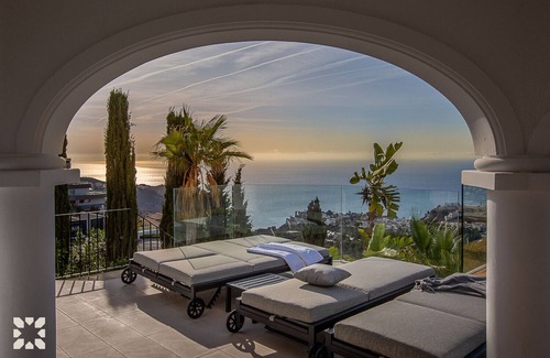 EXTERIOR: El exterior de esta villa es un auténtico remanso de paz, típicamente mediterráneo, donde cada detalle ha sido pensado para el confort y el relax. La terraza cubierta de la planta principal está amueblada con una gran mesa y ocho sillas, ideal para cenar al aire libre, así como una silla colgante con forma de huevo, perfecta para leer o simplemente relajarse mientras admira el paisaje circundante. La piscina, en el nivel inferior, está rodeada por una amplia terraza donde relajarse tomando el sol, con acceso directo desde los salones y dormitorios de la planta baja. Un chill out con sofás y cómodos sillones para compartir momentos con amigos.
