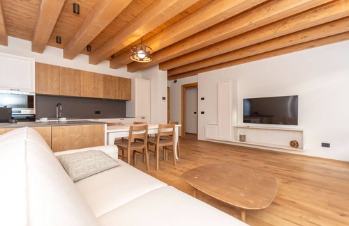 This apartment is a perfect blend of the cozy atmosphere of a typical mountain house and the practicality of a modern residence. The exposed beams and wooden details create a warm and enveloping atmosphere, giving you a feeling of an authentic contemporary mountain home.
