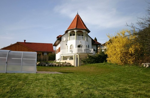 Nuestra exclusiva casa de vacaciones en Cserszegtomaj con vistas panorámicas de la ciudad balneario de Heviz, Lake Balaton (Balaton) y Keszthely. La casa está situada en las afueras de Cserszegtomaj (Spa Heviz), por debajo del bosque en una tranquila colina y lo mejor de cara al, en el borde del Parque Nacional. La casa tiene 3 niveles, cada nivel tiene un dormitorio, cocina, baño, sala de estar y comedor, terraza o balcón. Una gran superficie de unos 4.000,00 metros cuadrados. La piscina cubierta 9,30 mx 3,50 mx 1,40 m se puede utilizar desde mediados de marzo hasta finales de octubre. Terraza cubierta en la piscina y barbacoa. Cada nivel está equipado con televisión en, equipo de sonido con USB, WLAN.