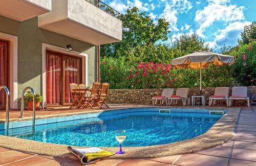 La villa tiene capacidad para 4-6 personas con una piscina privada totalmente equipada, en medio del bosque, rodeada de castaños a una altitud de 650 m. y todo eso a solo un respiro de las magníficas playas. Está amueblado con encanto clásico y toques modernos en hermosos colores. Dentro de la casita de dos niveles, hay 2 dormitorios en el nivel superior, uno con una cama doble y otro con gemelos que se pueden convertir en una cómoda cama doble si es necesario. En la planta baja, se encuentra un salón de lujo independiente, con chimenea, cocina totalmente equipada y zona de comedor. Los espacios exteriores incluyen una piscina privada con tumbonas y sombrillas a su alrededor para que los huéspedes disfruten del dulce sol de Creta.