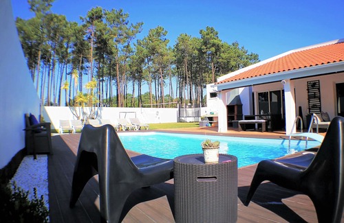 La piscina (climatizada en mayo junio y septiembre de agua salada es privada y tiene dos niveles de profundidad, que van desde el lado de profundidad de 1m a 2,3m de la placa del talón. Hay un servicio de ducha, piscina exterior, barbacoa, lavabo y baño completo con ducha.
