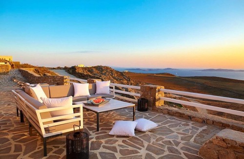 Choulakia Villa está situada en una zona tranquila en el lado occidental de Mykanos con vistas panorámicas del mar Egeo y la isla de Tinos. La villa tiene capacidad para 8 personas y es de arquitectura cicládica con curvas voluptuosas, arcos abovedados y techos de madera blanca, los muebles y las telas son de color gris y las grandes ventanas permiten la transmisión continua de luz solar natural al interior, que son solo algunos de los elementos que lograrán con éxito la armonía que estás buscando. Distribuidos en tres niveles distintos, hay 4 dormitorios con vistas al mar (2 de los cuales son dormitorios principales), 4 baños privados, una amplia sala de estar, un comedor y una cocina totalmente equipada. Los espacios al aire libre incluyen muebles de comedor, una zona de estar y una gran piscina privada con elegantes tumbonas con vistas al mar. Villa Choulakia se encuentra a poca distancia en coche de restaurantes, playas, además de las tiendas y la vida nocturna de la ciudad de Mykonos, pero al mismo tiempo ofrece un refugio tranquilo con impresionantes vistas al paisaje salvaje de las Cícladas y las espectaculares y coloridas puestas de sol sobre el mar de Agean..