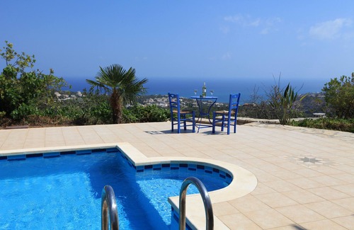 El jardín está plantado con plantas autóctonas y palmeras. La piscina de azulejos mide aprox. 8x4 m. Alrededor de la piscina climatizada hay una gran terraza para tomar el sol (en las estaciones más frías, si el clima lo permite). Hay cómodas tumbonas y sombrillas a su disposición. También hay una ducha exterior en la zona de la piscina. ¡Disfruta aquí de las fantásticas puestas de sol de Creta con una copa de vino! La piscina está a unos metros delante del dormitorio. Desde aquí también se tiene una excelente vista del mar y de Gerani.