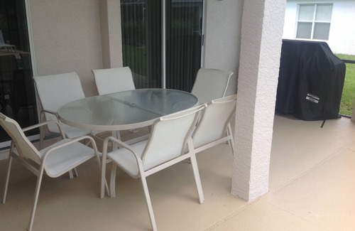 El área exterior es el lugar para estar en Ft Myers. Con un patio cubierto accesible desde el dormitorio principal, sala de estar o área de desayuno, puede disfrutar de la vista en todos los climas. Tenemos una nueva mesa de patio de vidrio templado con 6 sillas para disfrutar de comidas o un juego amistoso entre amigos y familiares. La piscina más allá mide aproximadamente 30 pies de largo y 14 pies de ancho. Tiene un extremo seguro y poco profundo para los nadadores que no tienen nada y un extremo profundo de 5 pies y 6 pulgadas para los más seguros. Un práctico asiento al final de la piscina te permite sentarte hasta la cintura en el agua y disfrutar de la vista sobre el lago o disfrutar de una bebida fría en los utensilios de plástico que ofrecemos.