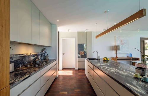 • Open plan Kitchen with fridge, gas stove, oven and microwave, dishwasher, coffee machine
