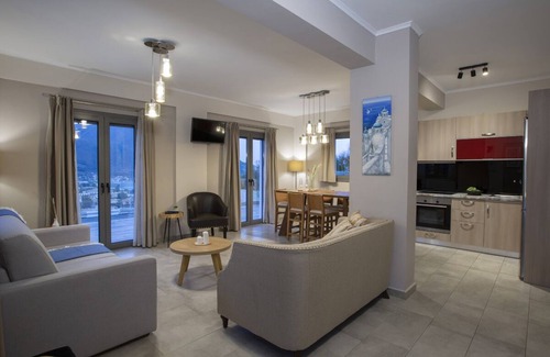 Al ingresar a Villa Ostria, usted camina hacia la gran área de cocina / sala de estar abierta con un moderno sistema de estanterías que se conecta a la mesa de comedor de concreto con taburetes de bar. La cocina está totalmente equipada con todo lo que pueda necesitar para disfrutar de sabrosas comidas griegas tradicionales. La moderna sala de estar ofrece un cómodo sofá cama doble, ideal para dos personas adicionales. En la planta baja hay un gran cuarto de baño familiar moderno con WC y ducha separados.