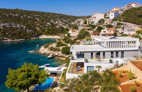 A tan solo unos pasos del mar esmeralda, esta joya de cuatro dormitorios es un trocito de paraíso, con impresionantes vistas, un diseño excepcional y una privacidad suprema. Perfecta para la familia y los amigos, Villa Endless Summer ofrece detalles encantadores, pura elegancia, muebles de lujo, interiores contemporáneos de última generación y habitaciones con baño privado. Una gran terraza conduce a una piscina infinita climatizada, tumbonas, instalaciones de barbacoa y comedor al aire libre para acompañar la puesta de sol. Hay varias terrazas con cómodos asientos tipo lounge a su disposición, cada una con una vista impresionante. Sauna, tenis de mesa, cocina de verano y una sala de fitness están a su disposición para su disfrute. Bienvenido al Adriático. Con cuatro dormitorios se pueden alojar cómodamente ocho huéspedes adultos. Vinišće es un pequeño y tranquilo pueblo de pescadores con un bonito puerto y una preciosa playa de aguas tranquilas, ideal para disfrutar del Adriático lejos de los destinos turísticos más concurridos. Aquí, los lugareños pasan su tiempo produciendo aceite de oliva, queso de cabra y conservando anchoas. La cocina es rica en mariscos frescos, aceitunas y delicioso vino Malvasía. Desde aquí, haga una excursión fácil a las islas cercanas y visite el casco antiguo de Trogir, declarado Patrimonio de la Humanidad por la UNESCO. Por transparencia: ten en cuenta que se debe abonar un depósito de seguridad de 1000 euros a la llegada directamente al anfitrión y que se devolverá a la salida, sujeto a inspección. No se admiten grupos de menores de 25 años.