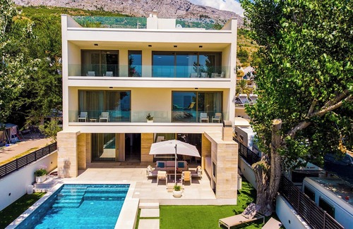 Discover the epitome of luxury at Beachfront Villa Erce, located directly on the pristine sandy beaches of Duće near Omiš. This exquisite villa offers an exceptional experience for family reunions or groups of friends, blending modern amenities with breathtaking natural beauty.