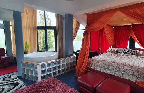 Pisos climatizados, 2 habitaciones con bañeras de hidromasaje, 1 sauna al aire libre, 1 jacuzzi grande al aire libre, vista de toda la zona circundante y las montañas Calimani, parrilla grande y 2 kayaks para su uso con acceso inmediato al lago. Villa francesa tiene para ofrecer.