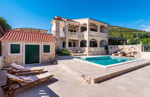 En el exterior, podrá disfrutar de la refrescante piscina de 35 m2, tomar el sol dálmata en una de las tumbonas o reunir a familiares y amigos en el acogedor salón cubierto para planear juntos excursiones por la hermosa región. Los amantes del bienestar no deben olvidar mencionar la sauna en la casa de la piscina, los niños se divertirán sin duda con la consola de juegos y, como pequeño punto culminante para los amantes del vino, la nevera de vinos en ambas cocinas no estará fuera de lugar. Como puede ver, hay para todos los gustos. :-)