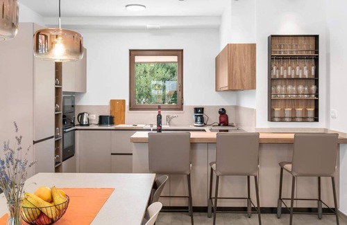 In the fenced garden of 1100 sqm, guests have at their disposal a 32 sqm pool, a sunbathing lawn and 8 sunbeds, a covered terrace with a table for outdoor dining, a summer kitchen, a children's playground, a volleyball and badminton court, and the possibility of charging electric cars with a surcharge. Only a few minutes by car from the house there is a restaurant, a water park, a petrol station, cafés and beautiful beaches.