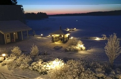 Villa Keidas es una villa de alquiler de alta calidad, construida en 2010, perfecta para familias numerosas o grupos de amigos para vacaciones compartidas, eventos corporativos, bodas y otras celebraciones familiares. El vecino más cercano se encuentra a 200 m y el camino privado se puede cerrar con una verja si es necesario. ¡NOTA! El destino NO SE ALQUILA a grupos formados por individuos menores de 30 años, para eventos como despedidas de soltero o similares. Un depósito de seguridad de 500 euros debe ser pagado en efectivo o a través de MobilePay a la llegada. El depósito de seguridad se devolverá el día de salida si todo está en buenas condiciones. La villa de 420 m² consta de seis habitaciones de tipo hotelero distribuidas en tres plantas. Cada habitación tiene su propio WC y ducha, aire acondicionado, televisión y patio o balcón privado. Hay un amplio salón con chimenea y una cocina bien equipada con comedor para 20 personas. La conexión rápida a Internet por fibra óptica de 100 Mbps y el generador eléctrico privado garantizan conexiones a Internet sin problemas y capacidad eléctrica, incluso con tiempo tormentoso. La carga de coches eléctricos está incluida en el precio, hay 2 estaciones de carga disponibles. El equipamiento infantil incluye 2 tronas y 2 cunas de viaje. En Villa Keidas, podrá disfrutar realmente de la experiencia de la sauna. Hay una sauna junto al lago con vistas al lago, una sauna cubierta con estufas eléctricas o de leña y una sauna de infrarrojos. Además de la sauna, podrá refrescarse en la bañera de hidromasaje exterior, la cascada de agua fría o la cabina de ducha de vapor. También hay una bañera de hidromasaje interior en el cuarto de baño. Se puede reservar sauna de humo para 10 personas por un suplemento de 300 euros, pago directo al propietario. Las instalaciones del spa incluyen vestuarios para mujeres y hombres, así como un salón con barra de bar y nevera. En la amplia zona ajardinada, pueden pasar tiempo juntos jugando, haciendo barbacoas, tomando sesiones de sauna, admirando las vistas desde la bañera caliente y nadando en su playa privada. El spa privado y las 4 saunas diferentes son una forma estupenda de relajarse. Hay 2 barcas de remos y un motor fueraborda eléctrico incluido en el precio. Además, se puede alquilar un motor fueraborda de gasolina al propietario. Está estrictamente prohibido traer mascotas a la Villa Keidas. Se pueden alquilar directamente al propietario diversos equipos deportivos, servicios de restauración, guías de pesca privados o incluso un masajista. Hay rutas de senderismo y esquí en los alrededores, así como buenas rutas ciclistas a una hora en coche, incluidos los Parques Nacionales de Repovesi y Leivonmäki. Pertunmaa a 7 km, Kuortti a 17 km, Mäntyharju a 27 km (incluido el Centro de Arte Salmela), Heinola a 52 km, Mikkeli a 53 km, el Parque Nacional de Repovesi a 55 km, Lappeenranta a 123 km, Helsinki a 189 km.