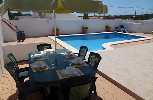 Este alquiler vacacional ofrece un espacio exterior privado con piscina, jardín, terraza y barbacoa.