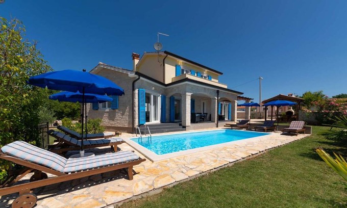Set in Nova Vas in the Istria region, Villa Monika has a terrace. The air-conditioned accommodation is 22 km from Aquapark Istralandia, and guests benefit from complimentary WiFi and private parking available on site. The holiday home features 3 bedrooms, a TV with satellite channels, an equipped kitchen with a fridge and a dishwasher, a washing machine, and 3 bathrooms with a shower. Towels and bed linen are featured in the holiday home. The holiday home offers an outdoor pool. Cathedral St. Eufemia Rovinj is 43 km from Villa Monika, while The Euphrasian Basilica is 9.2 km away. The nearest airport is Portorož Airport, 36 km from the accommodation.