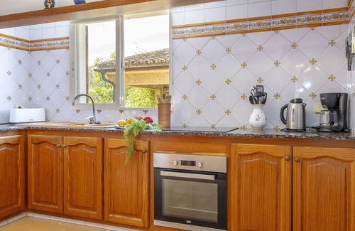 En el interior, la casa desprende el auténtico encanto de Mallorca: Los techos del salón y los dormitorios están decorados con vigas de madera típicas del Mediterráneo. La cocina independiente está totalmente equipada y no deja nada que desear.