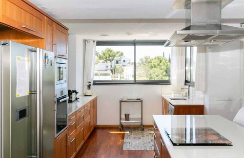 Our hugh modern villa was built in 2012, 500 m2 in a openplan living área, 5 bedrooms (one like a studio with separate entrance) 5 bathrooms, terraces, poolarea with wooden floor terrace and mediterranean garden,Have a nice relaxing holiday near the port, restaurants and beaches. Enjoy the privacy in the poolarea and terraces, sun and shade for everybody.
