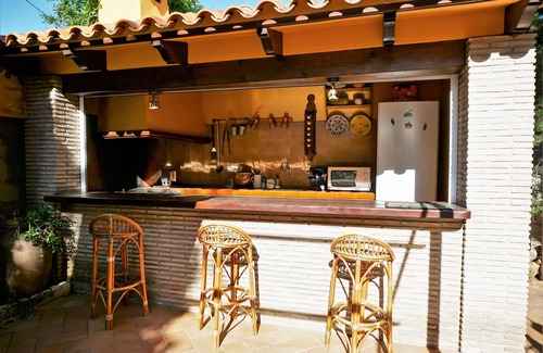 La parte este del chalet, ofrece una preciosa naya grande, con mesa y sillas, para estar a la sombra con vistas a la piscina. Al lado de la piscina privada hay una ducha y está rodeada de terrazas con tumbonas para disfrutar del sol a tope. La parcela, completamente vallada, es muy privada, con una puerta eléctrica y un gran carport para aparcar varios coches. El espacioso y muy atractivo chalet es para 8 personas y se distribuye de la siguiente manera: La planta baja ofrece un salón-comedor con chimenea, aire acondicionado y TV, y tiene acceso directo a la gran terraza cubierta, una amplia cocina bien equipada con lavavajillas y gran nevera-congelador, con acceso directo a la cocina de verano, 1 dormitorio doble, un baño completo y un cuarto de lavadora.