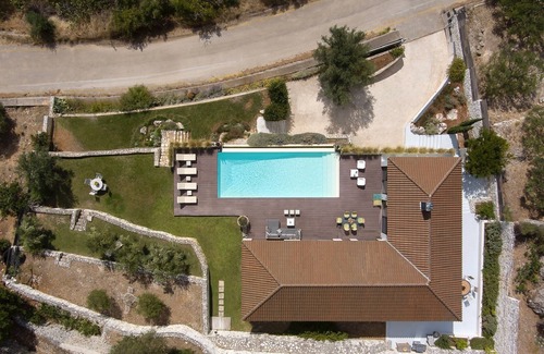 Villa Vilatoria es una lujosa residencia de cinco dormitorios en la isla de Kefalonia. La propiedad está situada en una zona tranquila, en una colina, con vistas al puerto de Agia Effimia. Rodeada de zonas verdes y con una vista majestuosa del mar y las montañas, con una gran piscina con una plataforma de madera, la villa tiene toda la esencia de un moderno santuario.