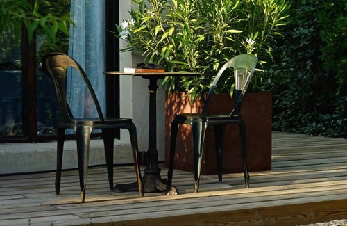 El jard��n mineral está salpicado de veinte olivos, una fuente, una bolera, varias mesas y sillas en el jardín que te permiten aislarte afuera.