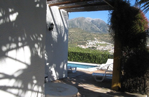 Chalet independiente de una sola planta con piscina privada, en terreno vallado y vallado con jardín establecido, entrada privada, terraza, terraza de la piscina, piscina privada. Impresionantes vistas de La Maroma, el valle y los pueblos blancos de los alrededores.