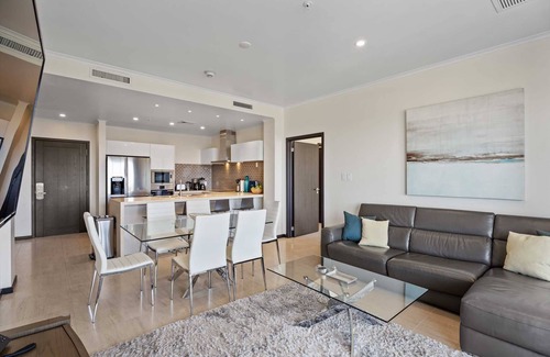 La sala de estar de planta abierta cuenta con un televisor grande, un sofá cama de cuero en forma de L (con un colchón de tamaño doble), una mesa de comedor de vidrio para 6 personas y una cocina moderna de tamaño completo totalmente equipada con 4 taburetes. La entrada tiene una escalera de caracol a la azotea y la sala de lavandería con lavadora-secadora e instalaciones de almacenamiento.