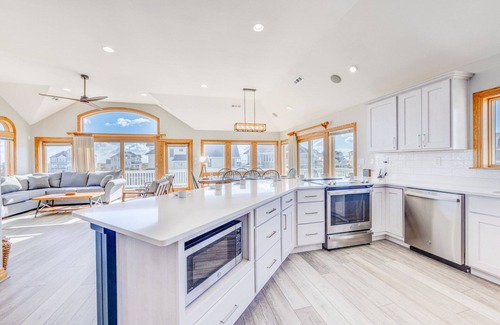 OCEANVIEW Avon - Ocean Isle Estates. Ubicado en la principal subdivisión de Avon, a solo 2 lotes del océano, a poca distancia de restaurantes, tiendas y un spa, AVON SEA BREEZE es una opción refrescante para sus vacaciones. Hay una pasarela bordeada a la playa a solo unos pasos, pero hay mucho que hacer en esta casa con todas las funciones, comenzando con la refrescante piscina privada, el relajante jacuzzi y la sala de juegos en la planta baja con mesa de ping pong y bar con barra completa. Refrigerador de tamaño y microondas. Muy cerca se encuentra el área de lavado. Dos habitaciones con televisores tienen acceso a los dos baños de la sala: uno con 2 camas individuales y otro con 2 juegos de literas. Si necesita un descanso en la playa, también puede dirigirse a la sala de medios del segundo nivel con sofá cama, acceso a la terraza y TV / DVD o retirarse a una de las cuatro habitaciones en este nivel. Hay dos dormitorios principales de reina y dos dormitorios principales de rey. Las mejores reuniones familiares se llevan a cabo en la gran sala de nivel superior, con una amplia sala de estar con TV de alta definición de 50 "y un comedor con mucha luz natural. Cocinar y limpiar es muy fácil en la cocina bien equipada con 2 refrigeradores, 2 lavaplatos y mucho espacio adicional. También en este nivel, encontrará un dormitorio principal con cama king size, TV, ducha y bañera de hidromasaje. Ascienda al área privada de loft con una cómoda área de asientos para leer un libro o simplemente escapar para una siesta tranquila. No hay duda al respecto, AVON SEA BREEZE te dejará boquiabierto. (La chimenea que se ve en las fotos no está disponible para uso de los huéspedes.)