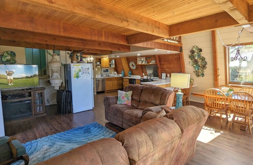 La casa tiene dos amplias habitaciones más un área de loft y una cocina bien equipada con lavavajillas para su conveniencia. La sala de estar y los comedores están ubicados en la planta baja con dos controles deslizantes grandes para disfrutar de la vista al mar desde ambas áreas. Un cómodo banco y una mesa de escritura se encuentra en el desván para ver el océano también. La sala de estar tiene un cómodo sofá y loveseat reclinables. Encienda la chimenea eléctrica y tome una siesta con uno de los lanzamientos suaves provistos. O mira tu película favorita en el televisor de pantalla grande. También hay un televisor en la habitación del segundo piso. Un armario con juegos y rompecabezas se proporciona para el tiempo de diversión.