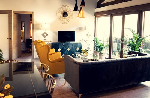 Apartamento de 80 m² distribuidos en una sola planta y en piso superior. Capacidad hasta 4 personas. La decoración está basada en estilo Glam-moderno. La combinación de elementos de estilo clásico se adaptan a colores y texturas intrincadas como patrones llamativos, brillos dorados y elementos reflectantes, creando un ambiente ecléctico y contemporáneo.