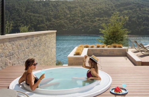 Prtlog (Duga Luka) a 5 km de Labin: La villa está ubicada en la bonita, protegida e intacta bahía de Duga Luka, cerca del mar, rodeada de la vegetación mediterránea. Villa "Vlastelini II", moderna, lujosa de 2 plantas del año 2018. Lugar tranquilo, soleado, a 30 m del mar, a 30 m de la playa, acceso directo a la playa. Privado: terreno 2'500 m2 (vallada), jardín bonito, cuidado plantas y árboles, piscina rectangular, climatizada (12 x 4 m, 50 m2, 140 cm de profundidad, Disponible por temporada: 21.Mar. - 31.Oct.) con escalera interior. WC en zona de piscina, ducha exterior, piscina de hidromasaje, terraza (25 m2), muebles de jardín. En el inmueble: acceso a internet, sauna, gimnasio, billar, calefacción central, alarma, lavadora, secadora. Posibilidad de cocinero (extra). Aparcamiento (para 4 coches) junto a la casa en el mismo terreno. Estación de carga eléctrica. Supermercado 5 km, restaurante 5 km, parada autobús 5.2 km, playa de gravilla, playa rocosa 30 m. Rutas de senderismo desde la casa 100 m, caminos para bicicletas 150 m. A tener en cuenta: grupos de jóvenes sólo bajo petición. Amarre privado, a demanda. Piscina con contracorriente y cascada. Piscina climatizada (extra). Hay que avisar 7 antes si quiere la piscina climatizada. Gimnasio con cinta para correr, bicicleta estática, orbitrek (entrenador elíptico), juego de pesas y esterillas y bancos para ejercicios independientes, billar, TV por satélite (pantalla plana), aire acondicionado y ducha/WC. En la casa: sauna finlandesa/bio sauna, sauna infrarrojos, ducha de reacción, cama de agua, sistema HI-FI de 5 zonas, acceso sin llave a la instalación, dardos. Grupos de jóvenes deberán dejar el doble de fianza. Disponible: pontón cubierto de madera para tomar el sol y entrar al mar, a 30 m del objeto. Masaje (extra) bajo petición. Interior de la villa decorado con fotos del local, artistas croatas.