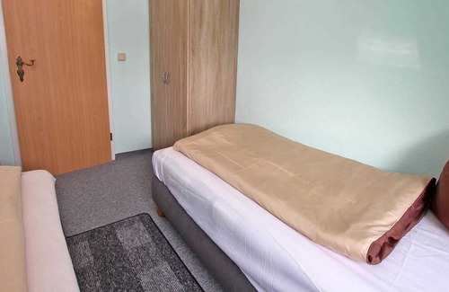 El amplio apartamento con capacidad para 5 adultos y 1 bebé en la planta superior tiene una cocina-comedor (comedor, sofá, TV de pantalla plana, placas eléctricas, refrigerador con congelador, microondas, div. Electrodomésticos de cocina), dos dormitorios (1 x 3 camas individuales, 1 x 2 camas individuales), un baño con bañera, inodoro y secador de pelo y un pasillo. TENGA EN CUENTA: el acceso a los apartamentos conduce a la entrada / pasillo común en el piso inferior, las habitaciones se pueden cerrar individualmente.