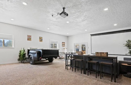 Thor's Cabin is comprised of the Main Cabin and the Theater Building. Inside the main cabin. you will find three bedrooms, each equipped with queen-sized beds (the third bedroom is equipped with queen-sized bunk beds) and two bathrooms. Inside the Theater Building, there is a loft with two queen-sized beds, as well as a unique and fun "truck bed," where you can cozy up in the bed of an old-school pickup truck while taking in a movie on the big screen - all the pleasures of a drive-in theater from the comfort and warmth of a fully renovated building.