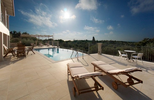 Hermosas vistas a través de hectáreas de olivos y cipreses hasta el mar Jónico brillante complementan esta elegante casa, situada cerca del emblemático puerto de Fiscardo (4 km) y su playa adyacente Emblisi (3,5 km), así como la pequeña playa encantadora de Alaties (5 km), donde la taberna junto al agua es famoso no sólo por la comida sabrosa, pero como un lugar codiciado para cócteles al atardecer.