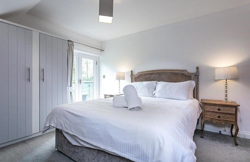Waterside boasts four bedrooms, each with its own en suite bathroom, providing ample space and comfort for every guest. The ground floor bedroom, featuring a king bed and feature French windows with a convenient en suite with a freestanding bath with a shower attachment, toilet and sink.