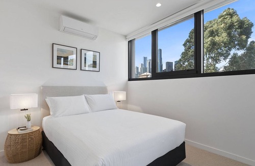 Impeccably designed, this unit is part of a brand new development. Spacious, bright, and beautiful, the interiors have been thought out to provide its guests with maximum comfort and an easy flow. The charming open-plan living area has a modern kitchen and a living room overlooking the undercover balcony. The inviting bedrooms grant views to the outside world — one overlooks the city and opens into the private balcony and the other overlooks the large, private patio you'll have access to when staying in this gorgeous property. With split system A/C, internal laundry, private car spot, access to the building's shared areas, and Melbourne skyline as your backdrop, this unit offers unparalleled urban luxury.