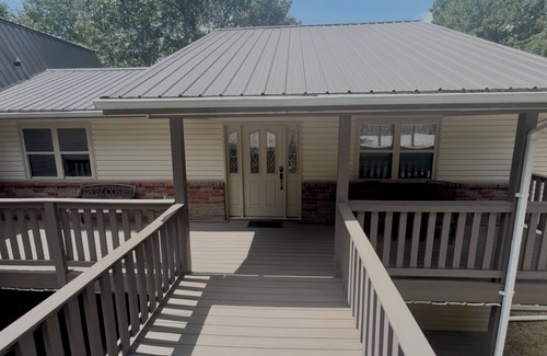 Tucked among the trees, this modern woodland house blends forest charm with sleek comfort. This property features two connected homes, each with its own entrance, kitchen, living space, and bedrooms. They are joined by a shared laundry room with one washer and dryer. So, whether you need a 2 Bed, 2 Bath, 4 Bed. 3 Bath or a 6 bed 5 bath this home will accommodate all your needs! This side is the 2 bedrooms and 2 full baths, it is the perfect getaway for couples, families, or friends looking to make memories or to branch out from the ordinary. Inside you'll find warm wood finishes, a cozy touch that makes you feel right at home. Whether you're relaxing enjoying nature or sipping coffee on the deck, this stay is sure to "leaf" you refreshed!