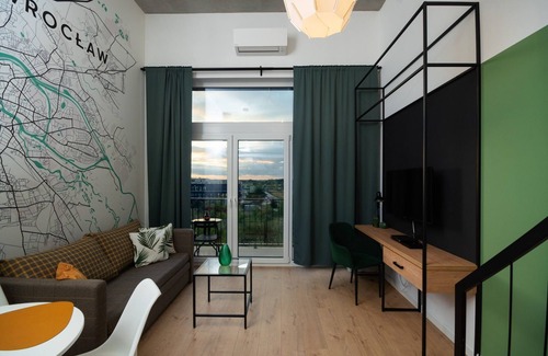 Wrocław Airport Green Studio features a stylishly furnished living room with a kitchenette and a loft with a comfortable double bed, a bathroom and a spacious balcony, where guests can relax and enjoy their morning coffee or an evening glass of wine. Guests have a range of practical amenities at their disposal, including free Wi-Fi, a television, washing machine, hairdryer, iron, microwave, fridge, and kitchen accessories. The apartment is equipped with air conditioning, providing exceptional comfort, especially on hot days.