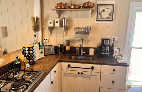 It is nestled in the back corner of our property, with ample privacy and a designated driveway. The cottage is designed for two guests and is set up with only one queen-size bed. If you need an extra bed, you must let us know when making your reservation. The cleaning staff will then arrange to bring someone to help set up the single bed.